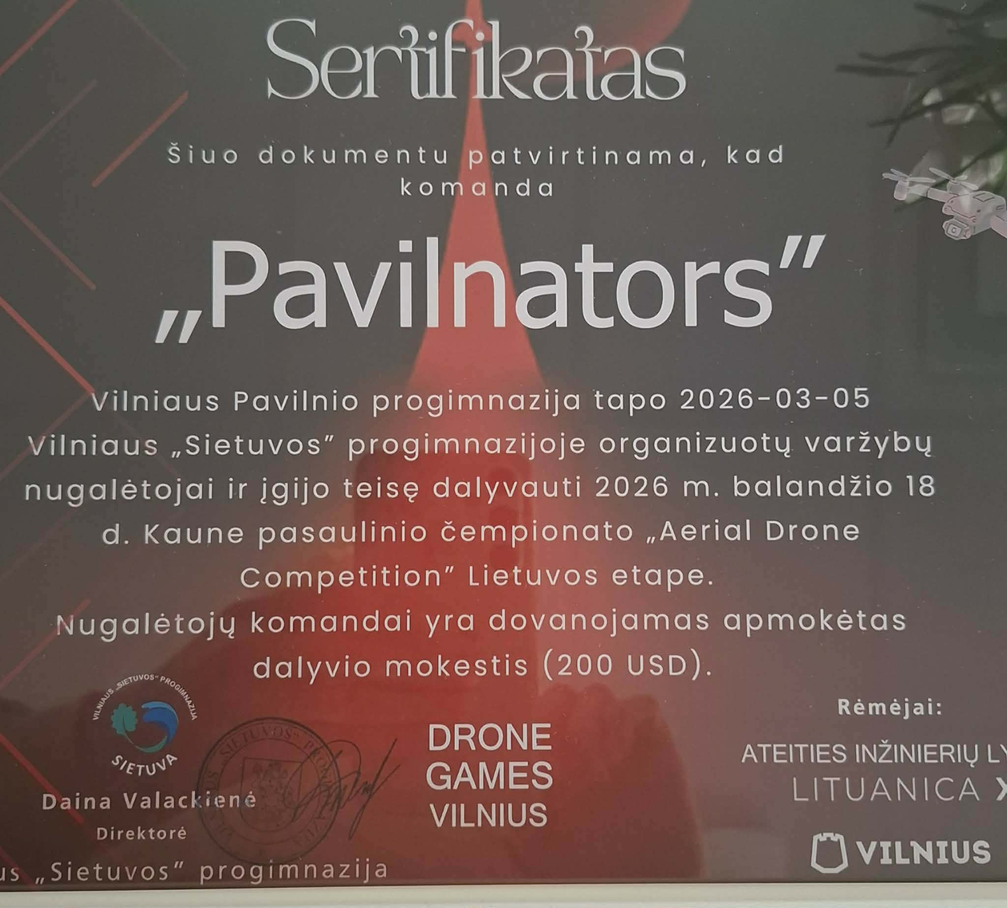 Ši pergalė mums atvėrė dar didesnes galimybes – patekome į pasaulines „Aerial Drone Competition“ varžybas, o dalyvavimo vieta jose yra apmokėta (200 $). ![]()